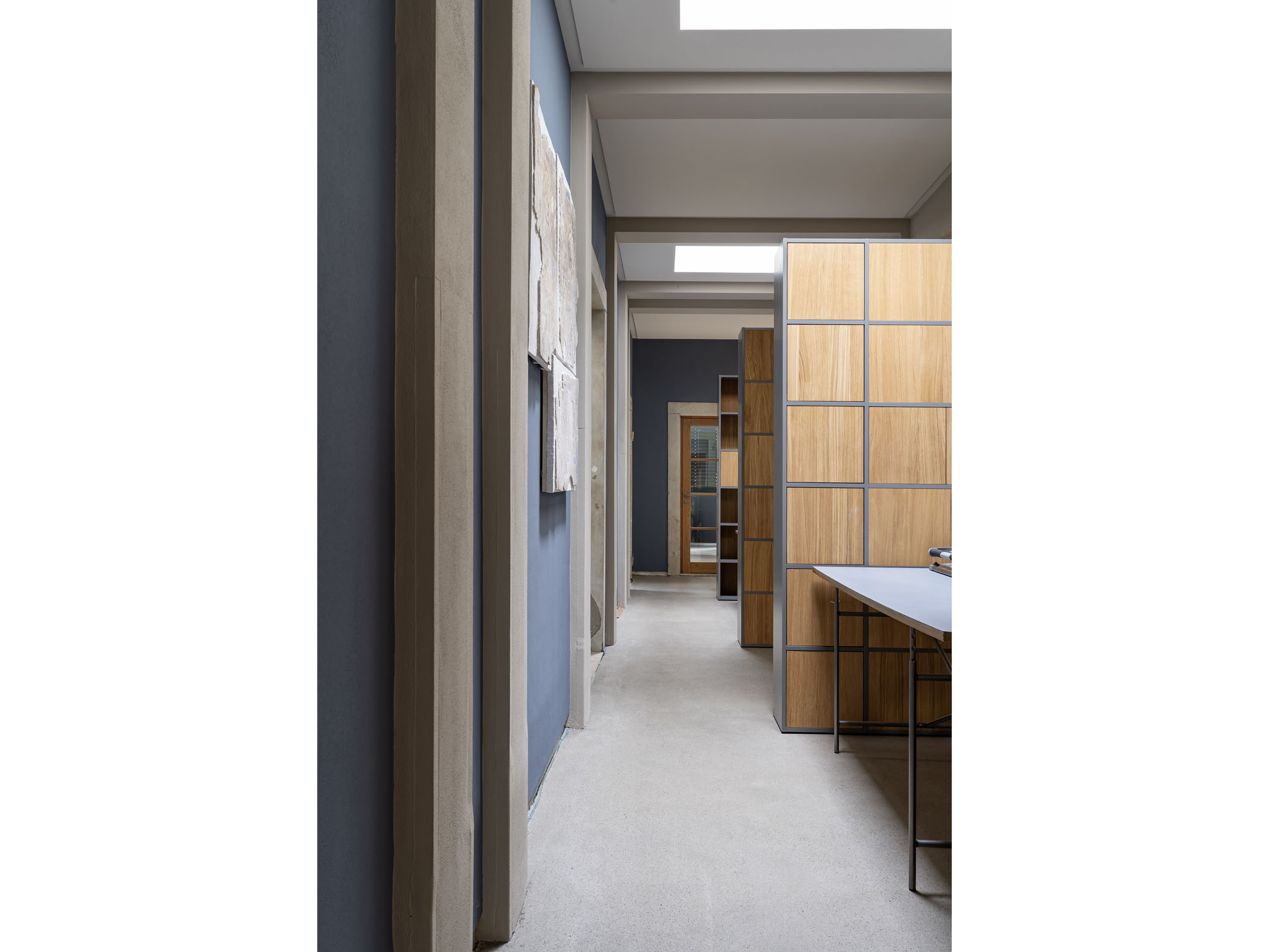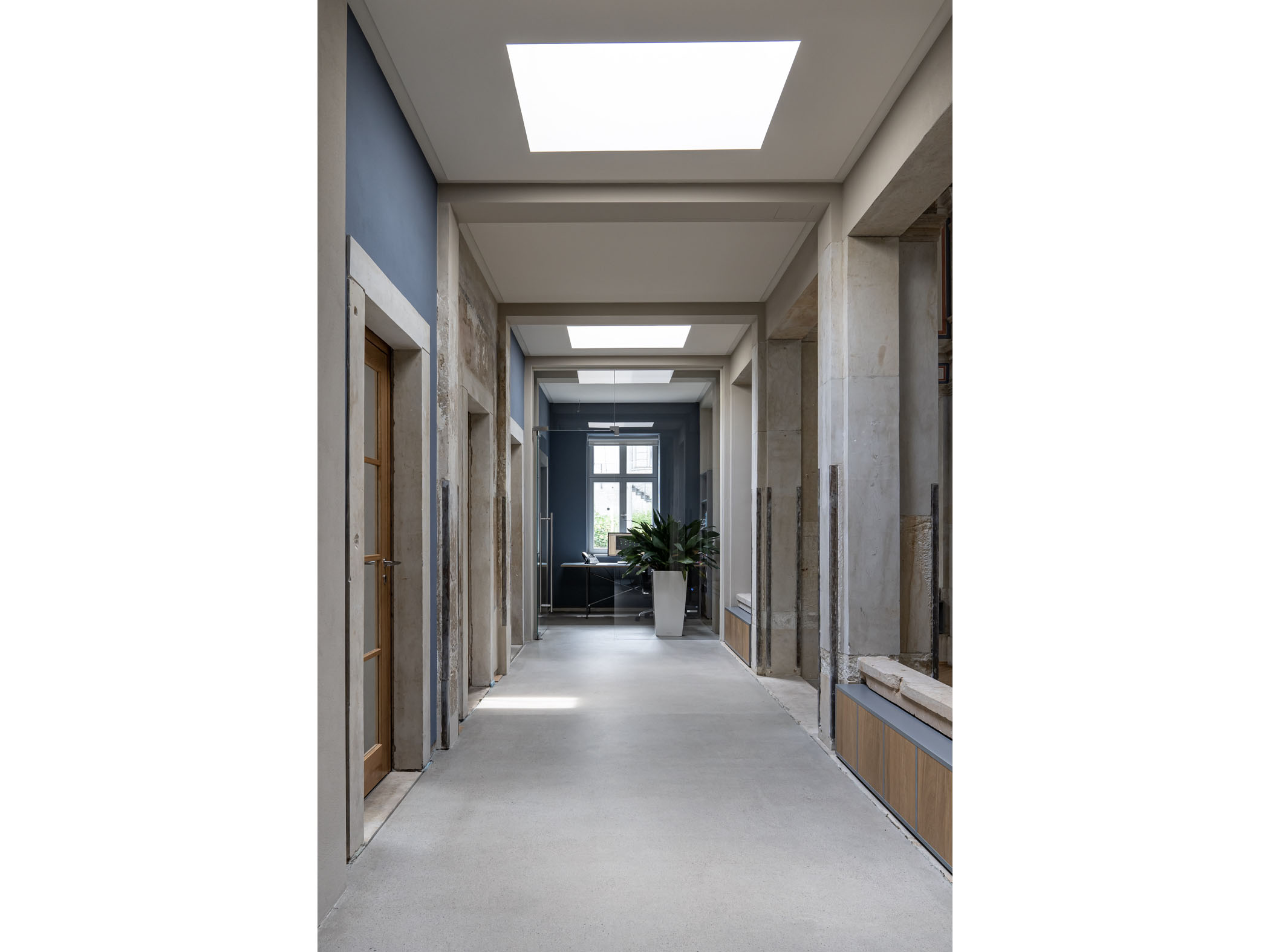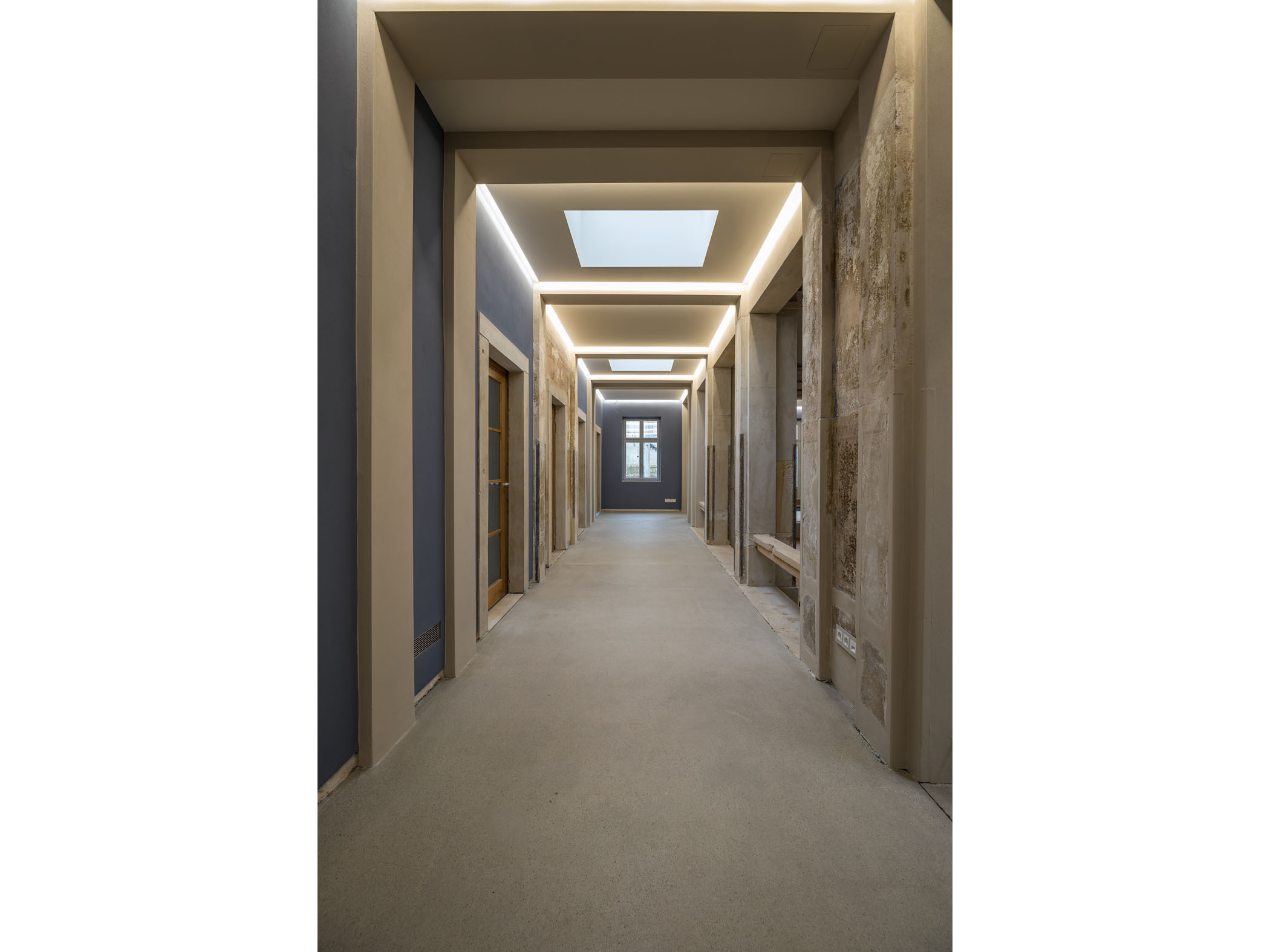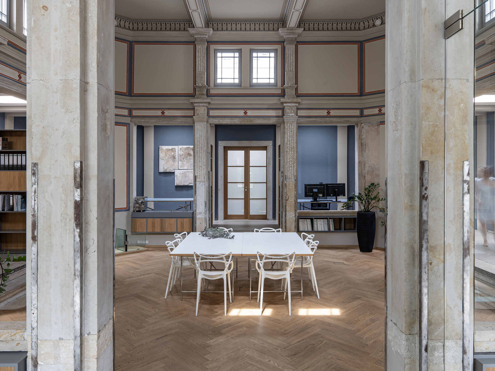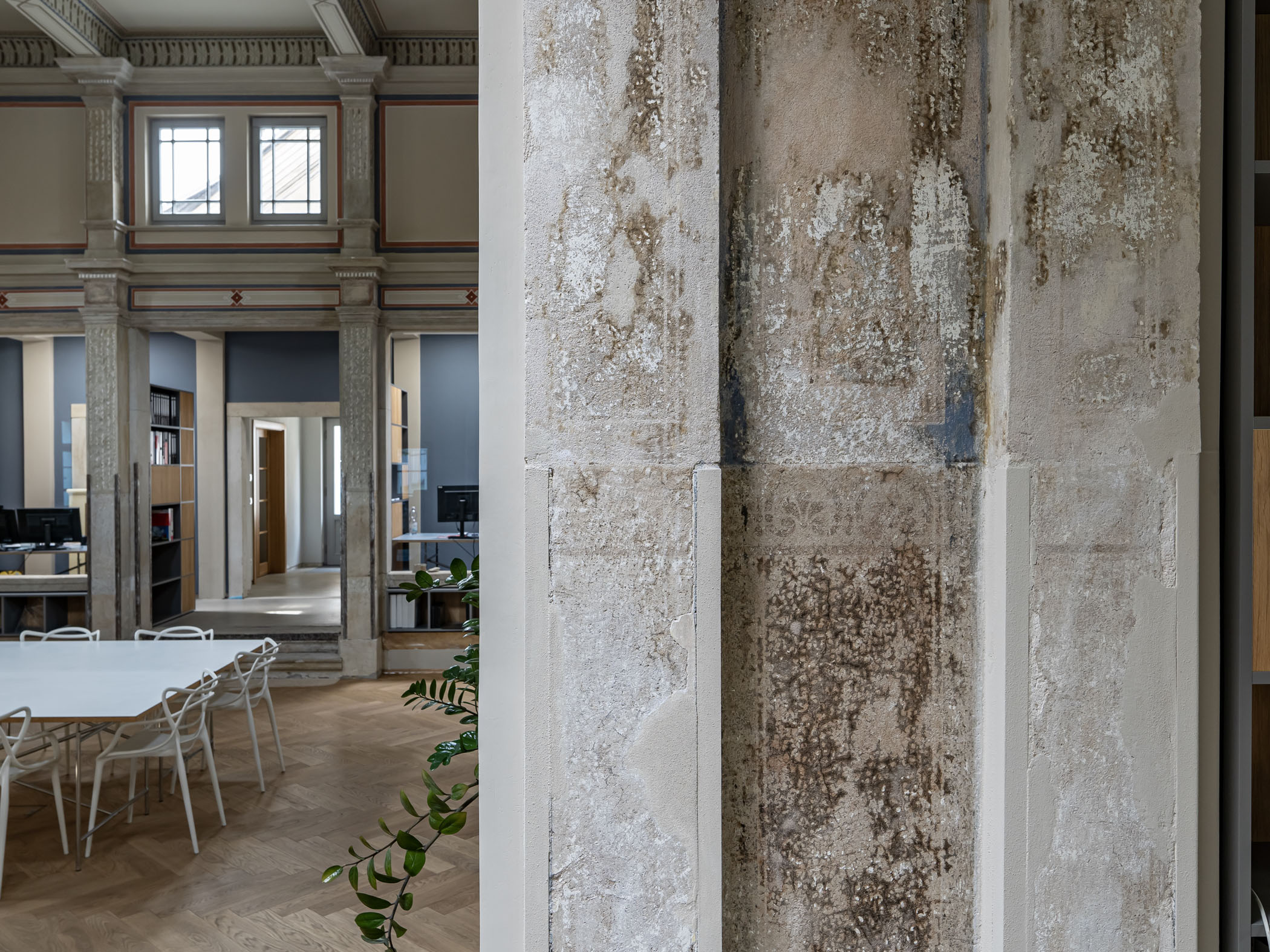 Vorgefundenen Wand- und Deckenbemalungen wurden wieder aufgenommen und nach historischem Vorbild teilweise wieder hergestellt. Nicht wieder herzustellende Befundflächen wurden in Teilbereichen konserviert und somit in die heutige Zeit implementiert. Die Farbgestaltung des Atriums orientiert sich am Bestand. Die blaue Farbigkeit der Arkade setzt einen kraftvollen Impuls als Brückenschlag ins Heute.