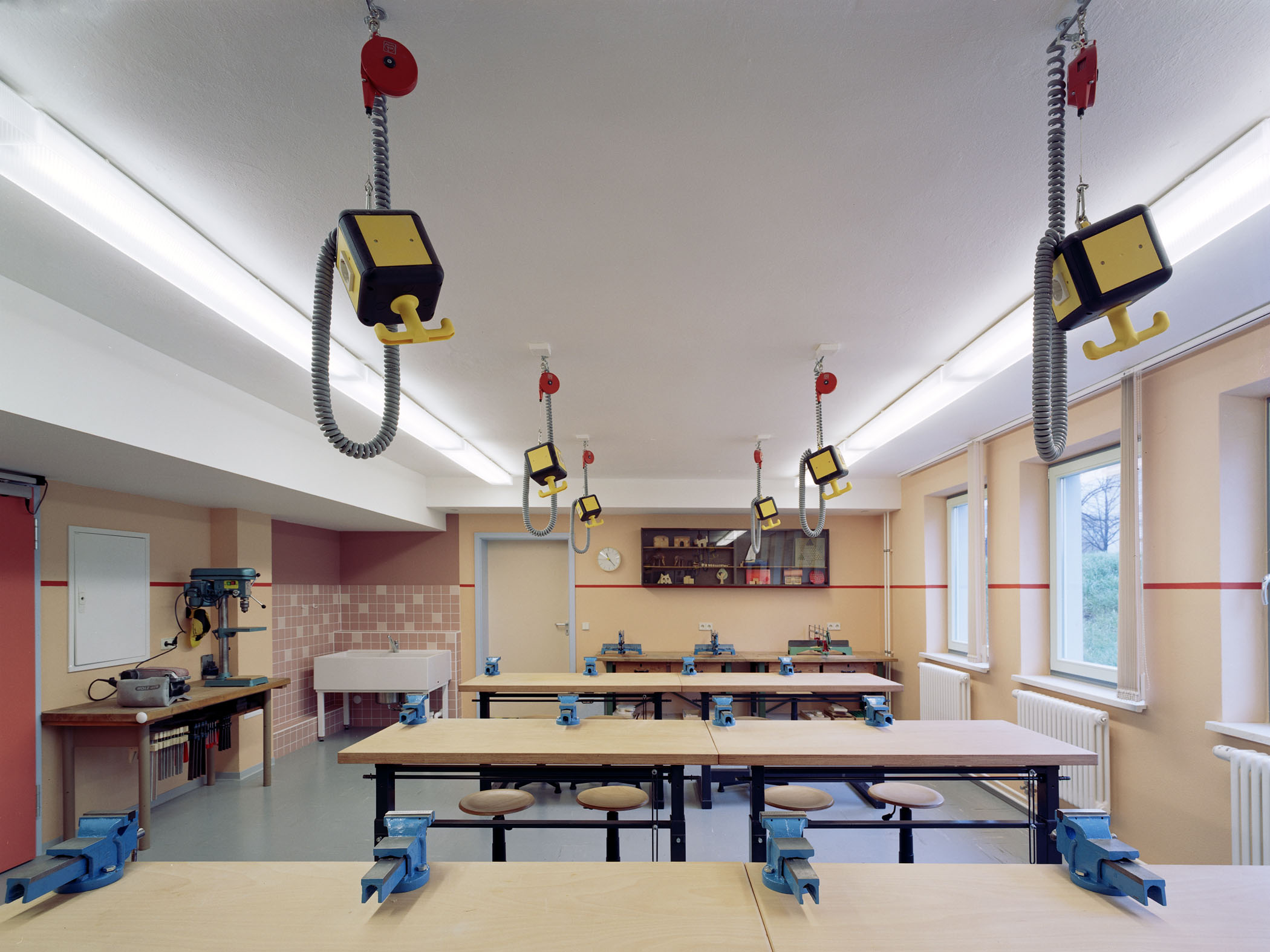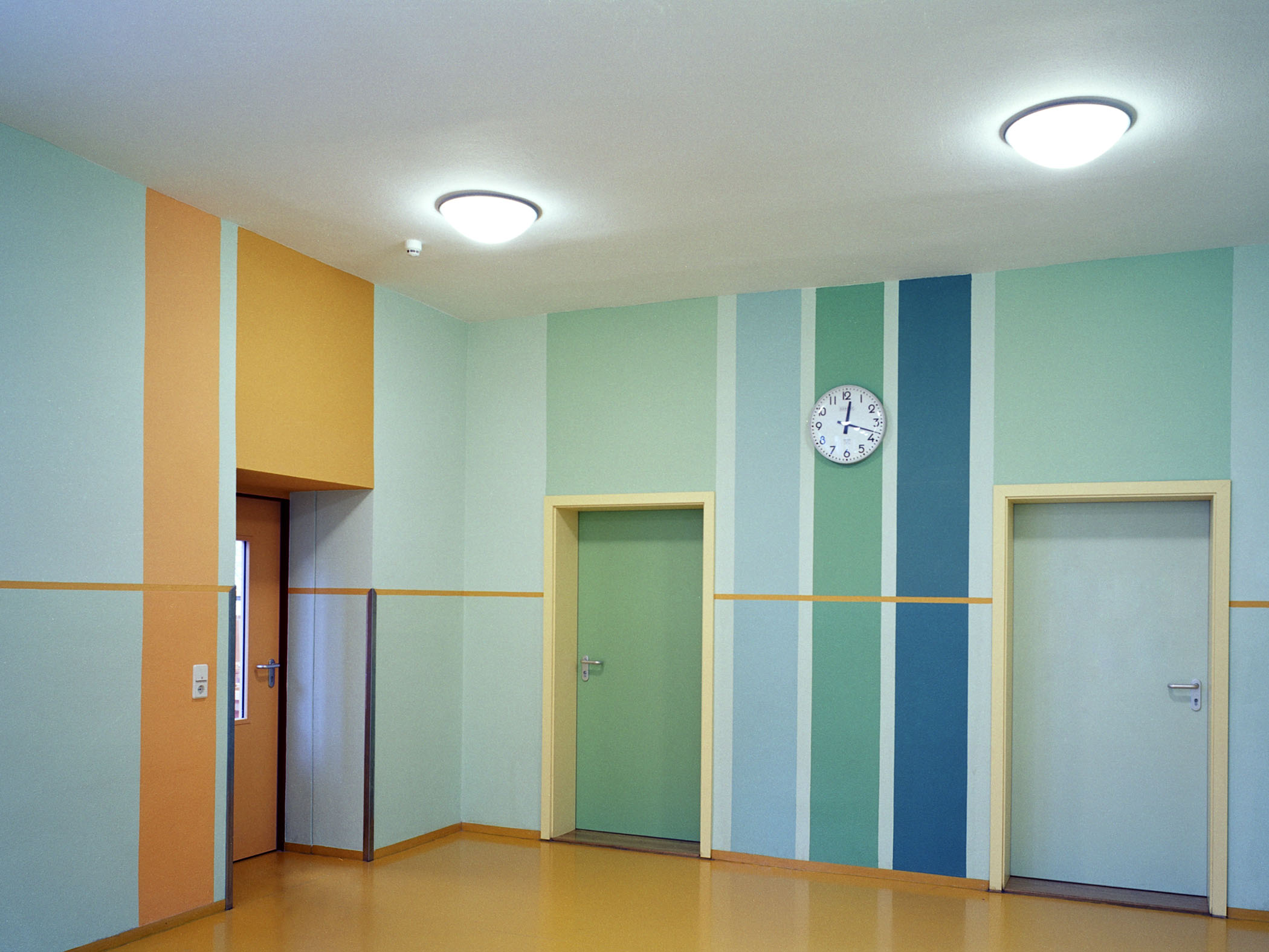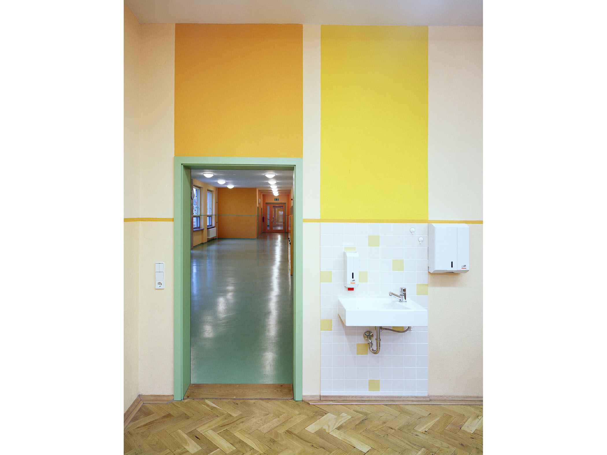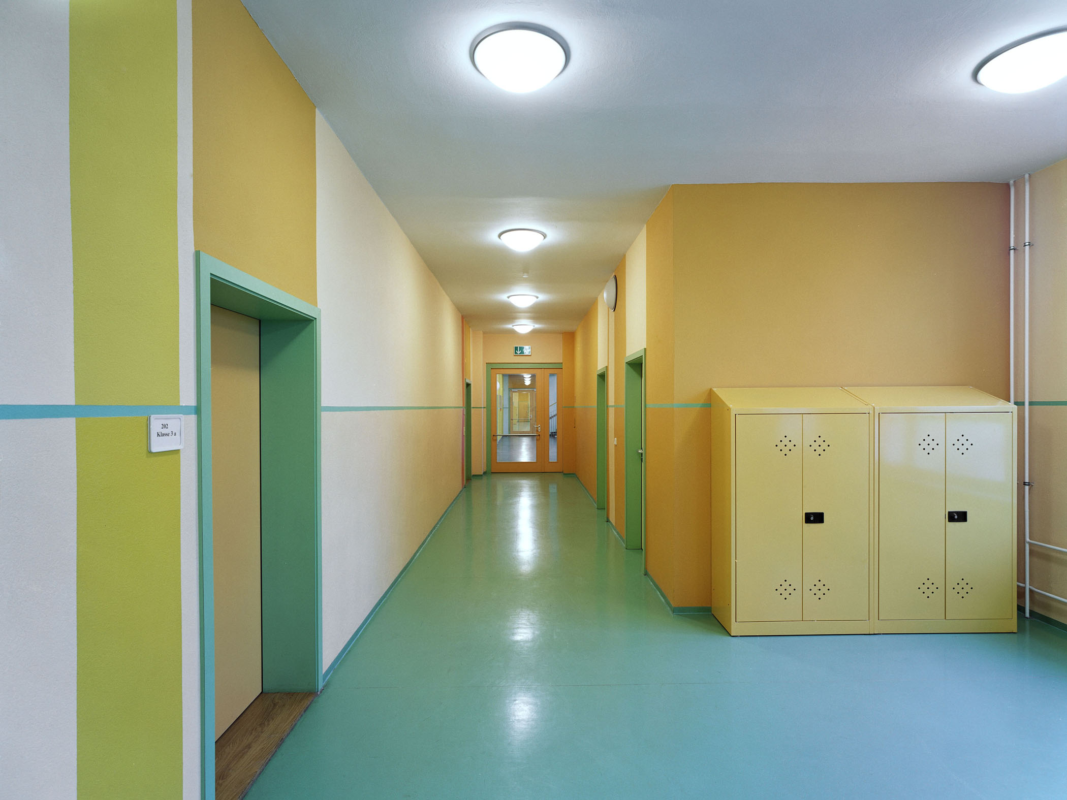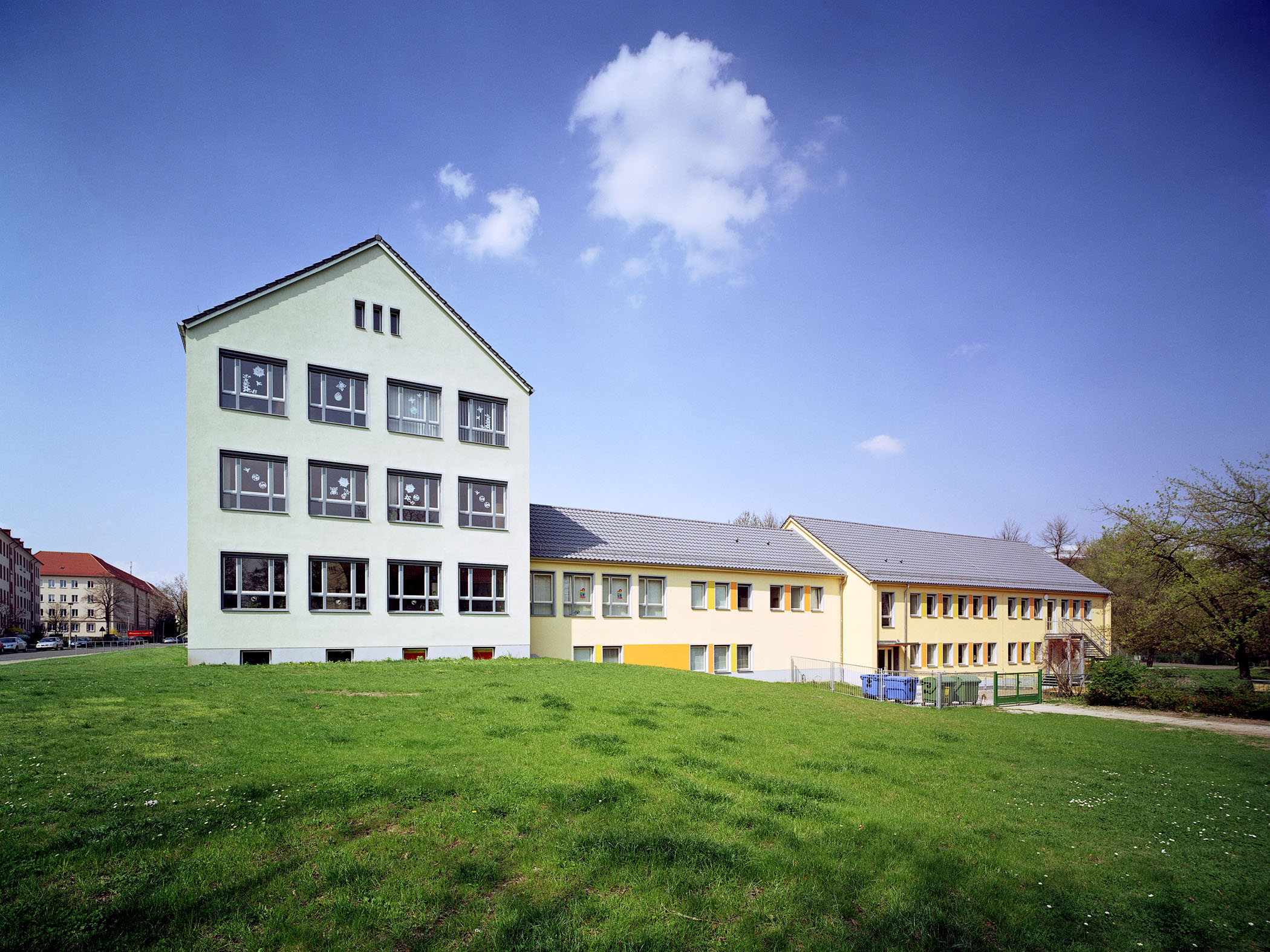 Das 1963 erbaute Schulgebäude mit Hortbereich, Mensa und Turnhalle wurde für 3,6 Mio € so umgebaut und saniert, dass es den besonderen Anforderungen einer Integrationsschule Rechnung trägt. Eine große Bedeutung kommt deshalb bei dieser Bauaufgabe der Farbgestaltung zu. Sie übernimmt die Aufgabe der Orientierungshilfe. Die einzelnen Nutzungseinheiten erhalten zur Ablesbarkeit und Orientierung der Kinder innen und außen einen eigenen, unverwechselbaren Farbton. Die Räume werden durch einen „Strichcode“ leichter zuordenbar. Es entsteht ein sinnliches Farberlebnis, das ein angenehmes Raumklima erzeugt. Das Gebäude behält trotz der neuen Gestaltung den ursprünglichen Charakter seiner Zeit.