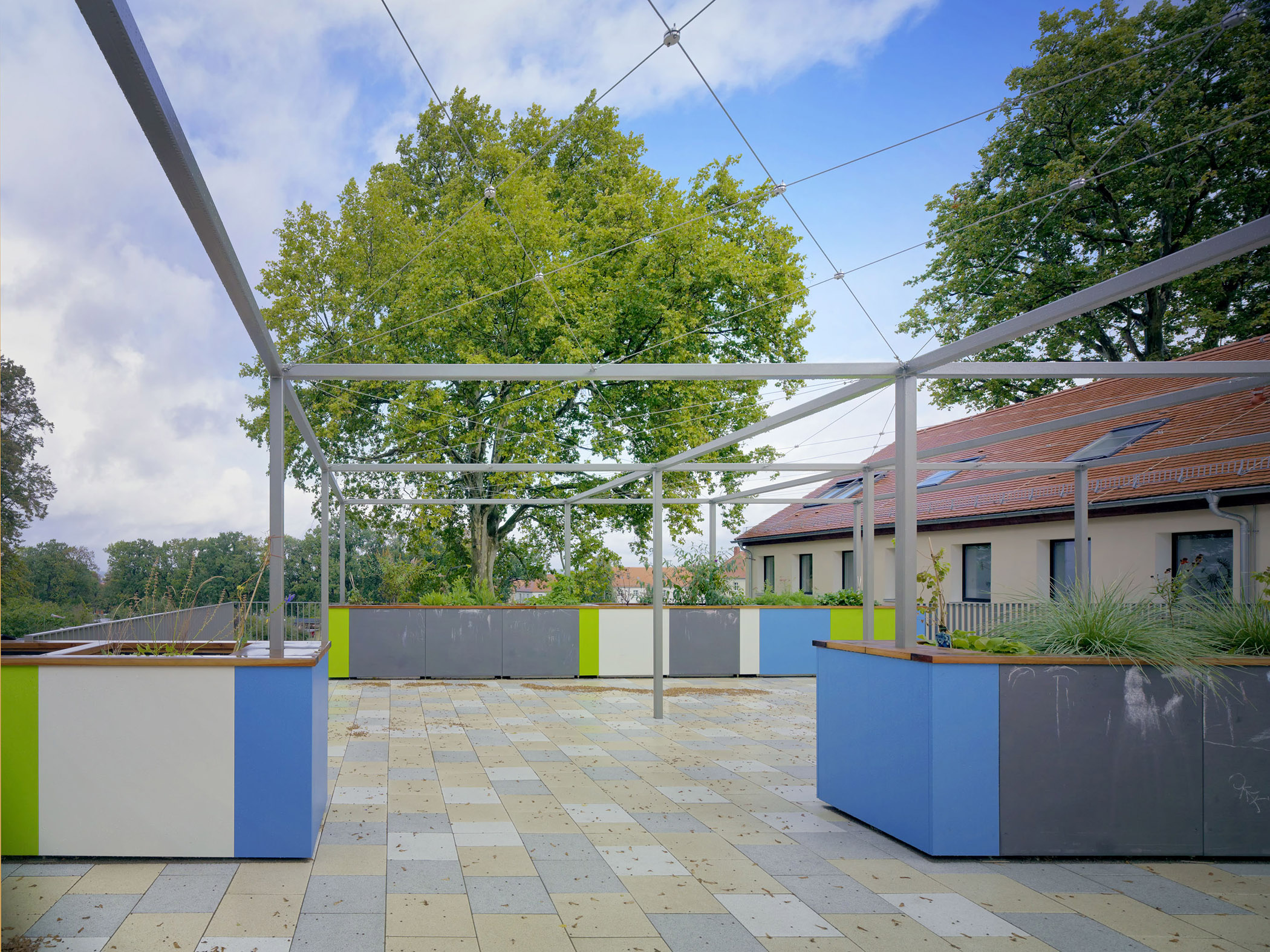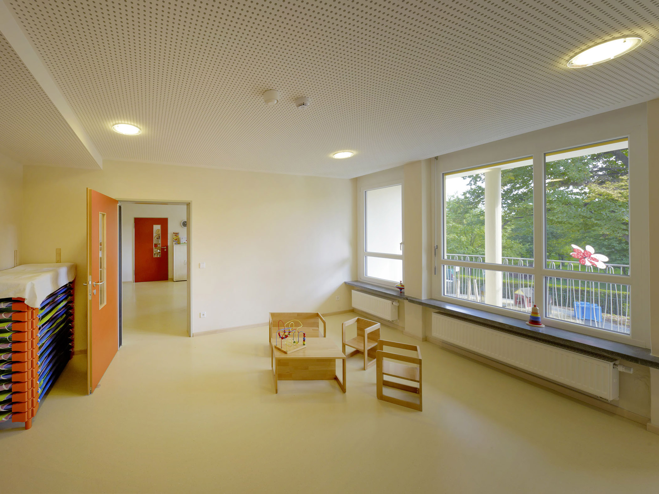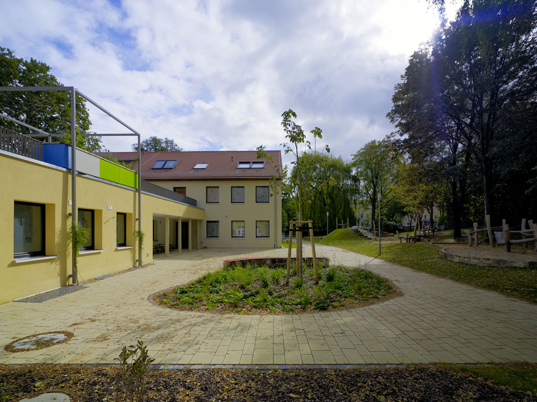 Es erfolgte nun vom Hochbauamt der Auftrag, das gesamte Gebäude planerisch zu betrachten. Durch den Eigenbetrieb Kindertrageseinrichtungen wurde ein gewachsener Bedarf an Betreuungsplätzen angemeldet. Darauf hin wurden auch die Gruppenräume im EG und OG auf ihre Kapazität hin optimiert. Im Anbau des EG entstanden zwei neue Gruppen für Kindergartenkinder. Die bis dahin an dieser Stelle untergebrachte Kinderküche und Ausgabeküche wurden in das KG verlagert. Ein Werkraum konnte ebenfalls im KG neu geschaffen werden. Diese Räume gruppieren sich großzügig um einen neu entstandenen abgesenkten Hof.