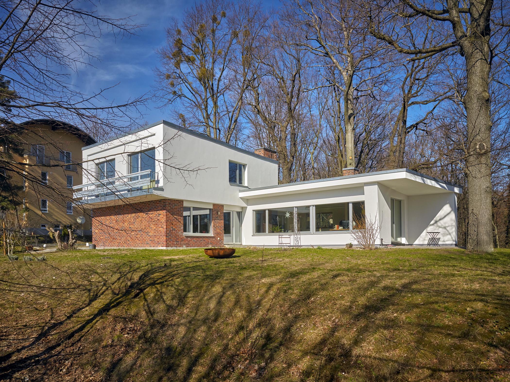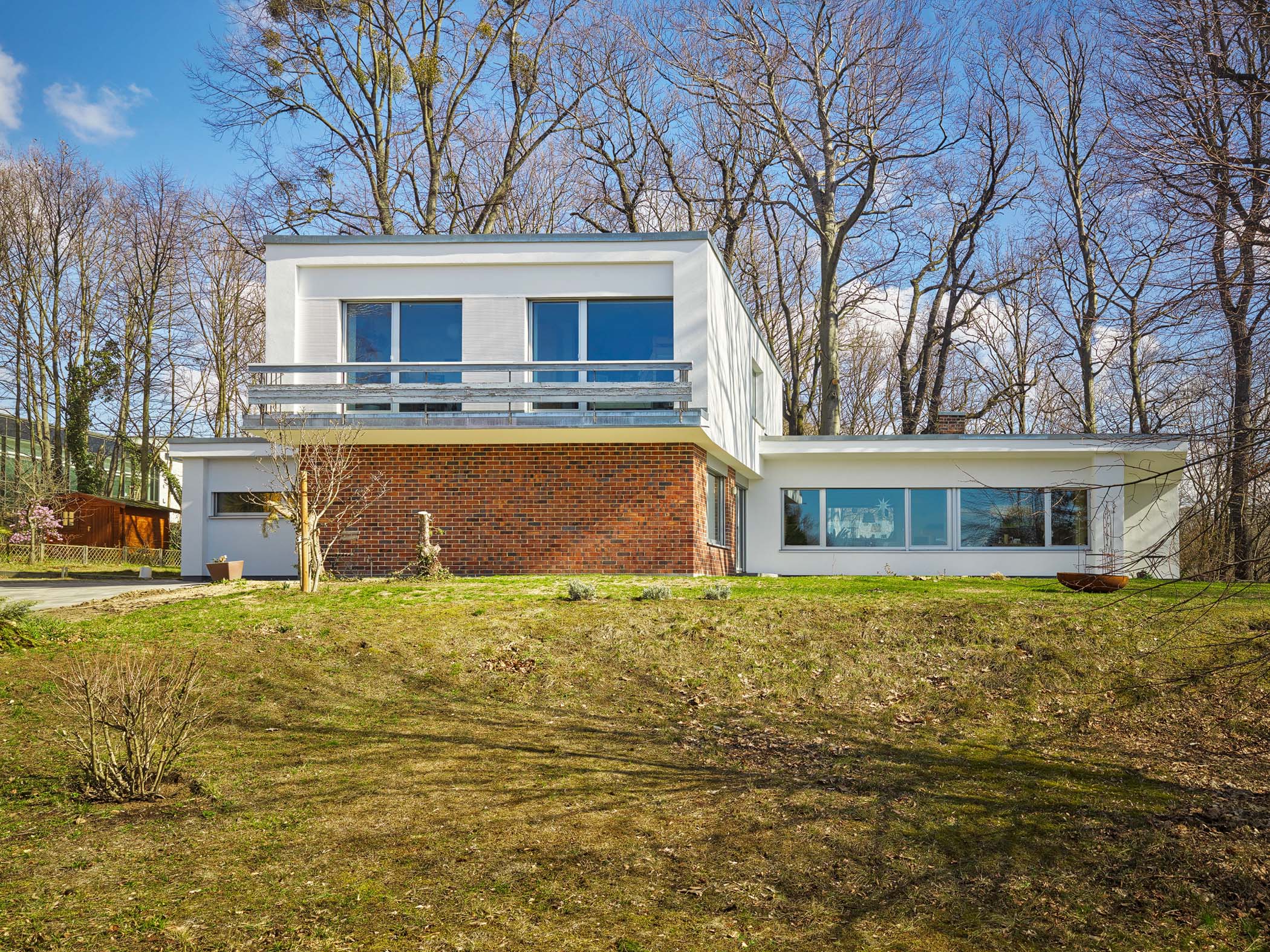 Die Fassaden werden moderat verändert. Durch die Öffnung der rückseitigen im Bestand, bis auf die Küche, vollständig geschlossenen, Fassade und die Öffnung der Fassade zur vorhandenen Überdachung werden nun atemberaubende Blicke zum umgebenden Wald aus dem Innenraum heraus ermöglicht. Eine Terrassentür, die den horizontalen Duktus der 60-iger Jahre- Architektur stört, wird in Abstimmung mit dem Denkmalamt geschlossen und durch grosszügige Terrassenfenster in Richtung der vorhandenen Überdachung ersetzt. Auch im Obergeschoss werden die vorhandenen Fenster der markanten, aus dem Klinkersockel herausragende Südfassade, beruhigt und zu bodentiefenen Fenstern vergrössert.