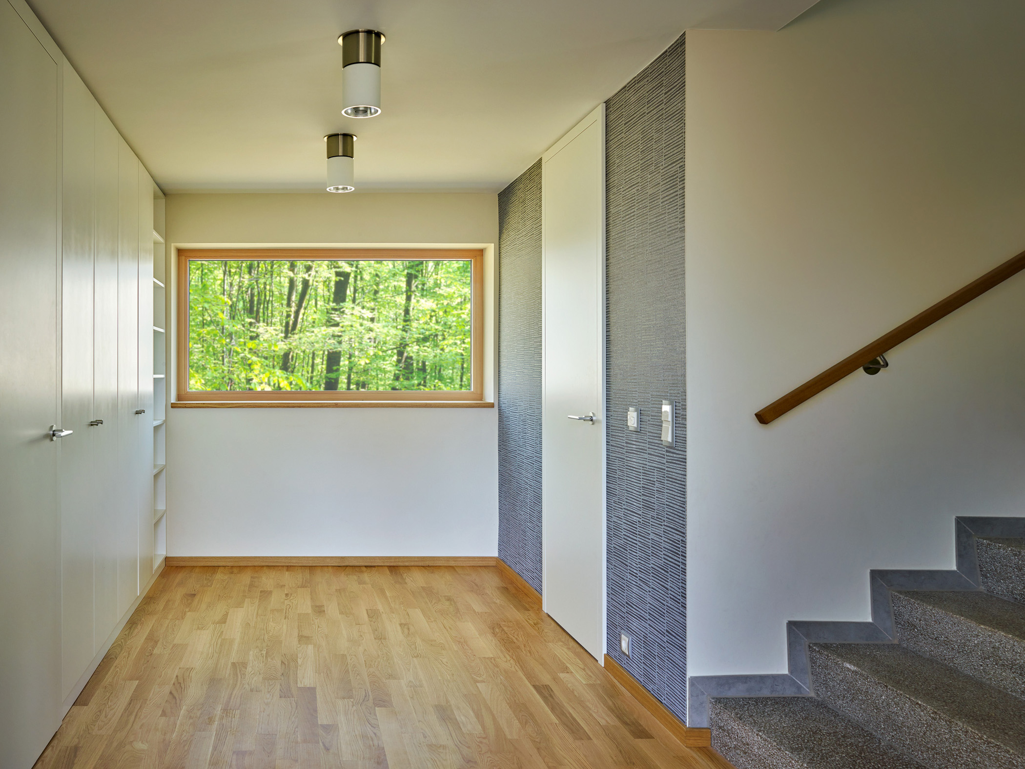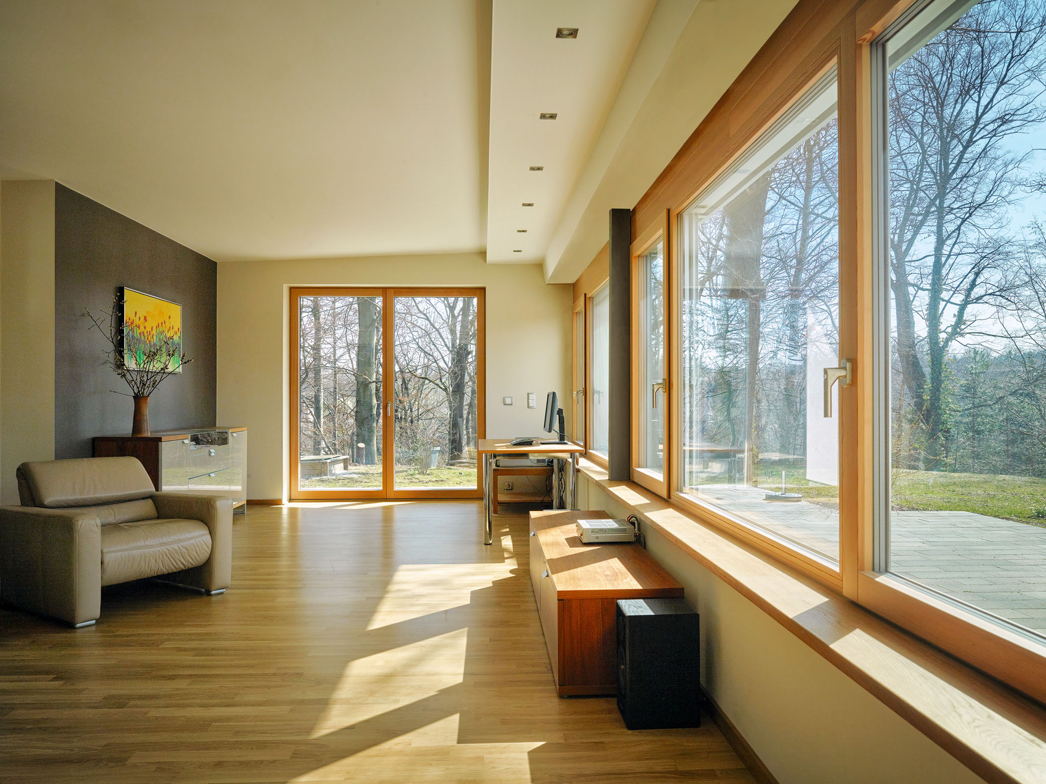 Durch die ergänzten und veränderten Fensteröffnungen wird das Gebäude, trotz seiner Nähe zum Waldrand, zu einem lichtdurchfluteten Ort mit heilsamen Aussenraumbezug zur Natur – „natura sanat“. Das Gebäude wird energetisch auf den gültigen ENEV- Stand ertüchtigt und erhält damit angepasste Dach- und Fußbodenaufbauten, ein Wärmedämmverbundsystem, die Erneuerung der Heizanlage und der Heizflächen und neue Fenster mit überputztem außenliegenden Sonnenschutz. Feuchte Aussenwandbereiche werden trocken gelegt.