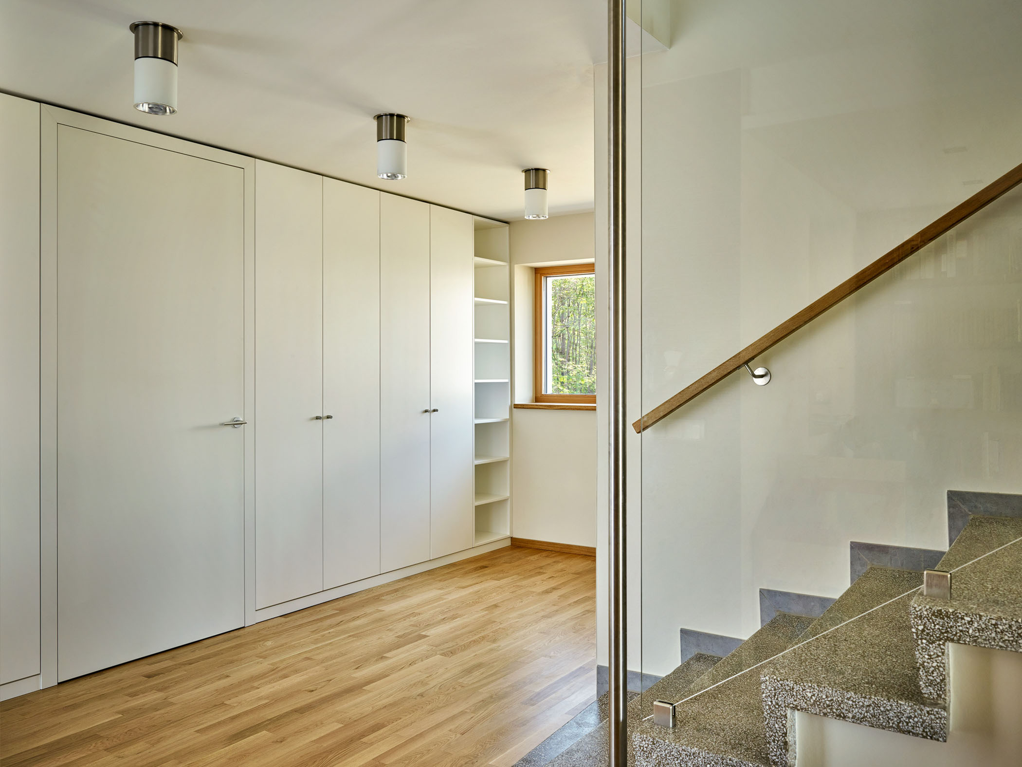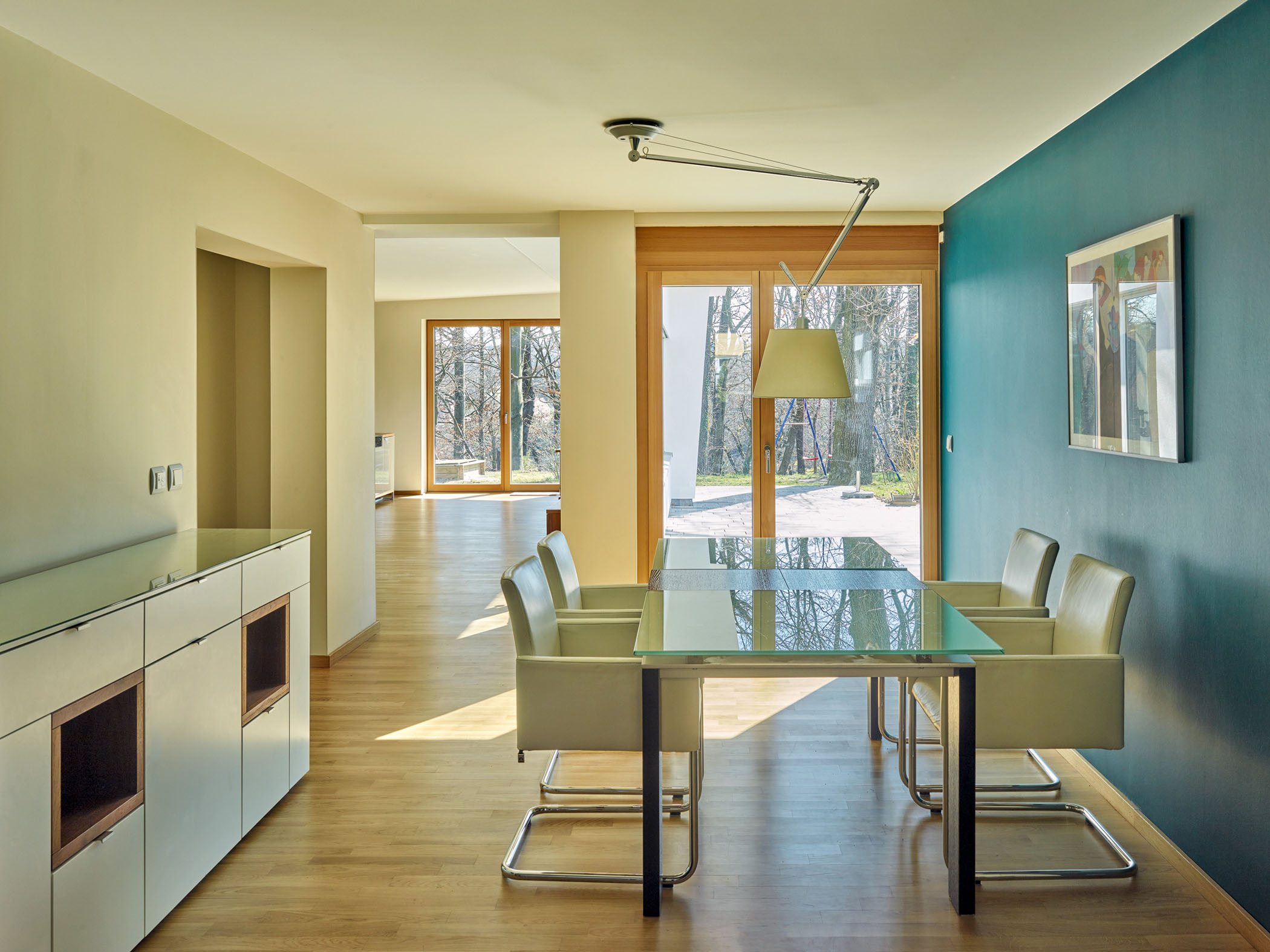 Durch den nur einmaligen Eigentümerwechsel seit der Erbauung des Gebäudes und dessen achtsamen Umgang mit der Gebäudesubstanz sind fast alle originalen Einbauten erhalten. Die Baumaßnahme beinhaltet daher die Sanierung und Umbau des Hauses mit dezenten Eingriffen in die Fassaden und die behutsame Optimierung der Grundrisse. Um den Wohnraum an die heutigen Bedürfnisse einer 5- köpfige Familie anzupassen, werden dezente Eingriffe im Grundriss vorgenommen: die vorhandene Garage wird zum Elternschlafzimmer umgebaut, ein Raumteiler zwischen zwei Kinderzimmern wird zur Raumvergrösserung des 2. Kinderzimmers rückgebaut und eine Trennwand wird zugunsten eines geräumigeren Essplatzes entfernt. Die Entfernung eines WCs ermöglicht nun die ganztägliche Belichtung und Besonnung dieses gemeinsamen Lebensbereiches. Im Eingangsbereich wird ein heller wandfüllender Einbauschrank ergänzt. Dieser wirkt wie eine Wandverkleidung und integriert ebenso den Zugang zum neuen Elternschlafzimmer mit Ankleide. Eine neu zu errichtende Pergola dient zukünftig als Überdachung der PKW- Stellplätze und des Eingangsbereiches.