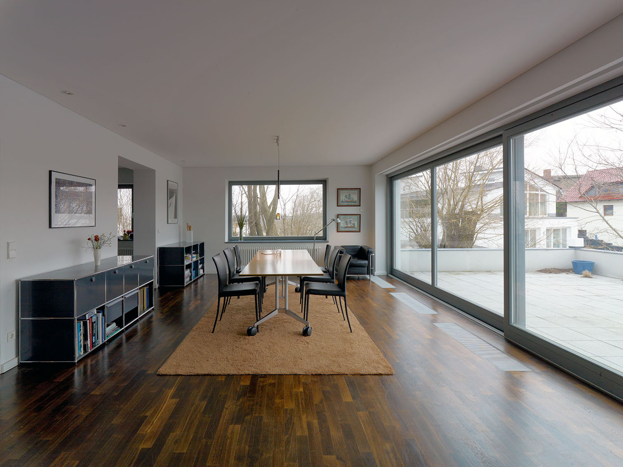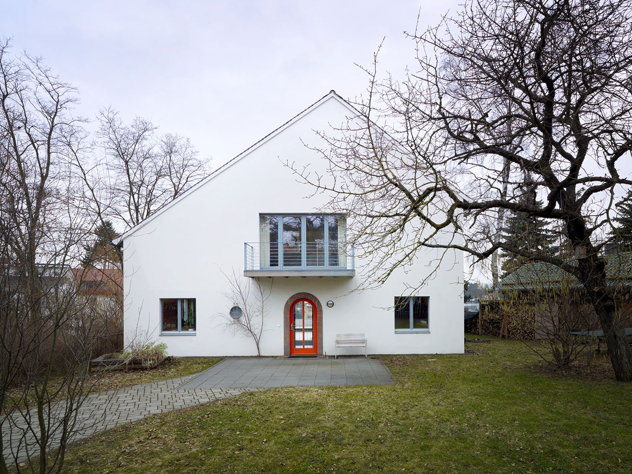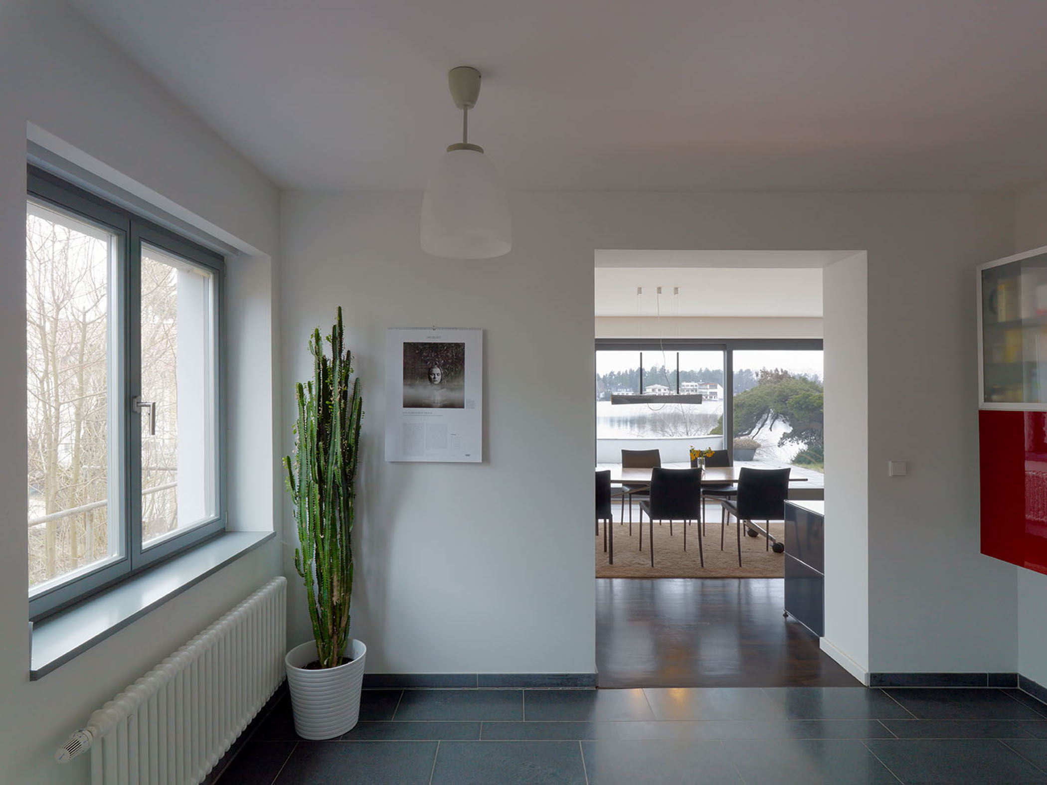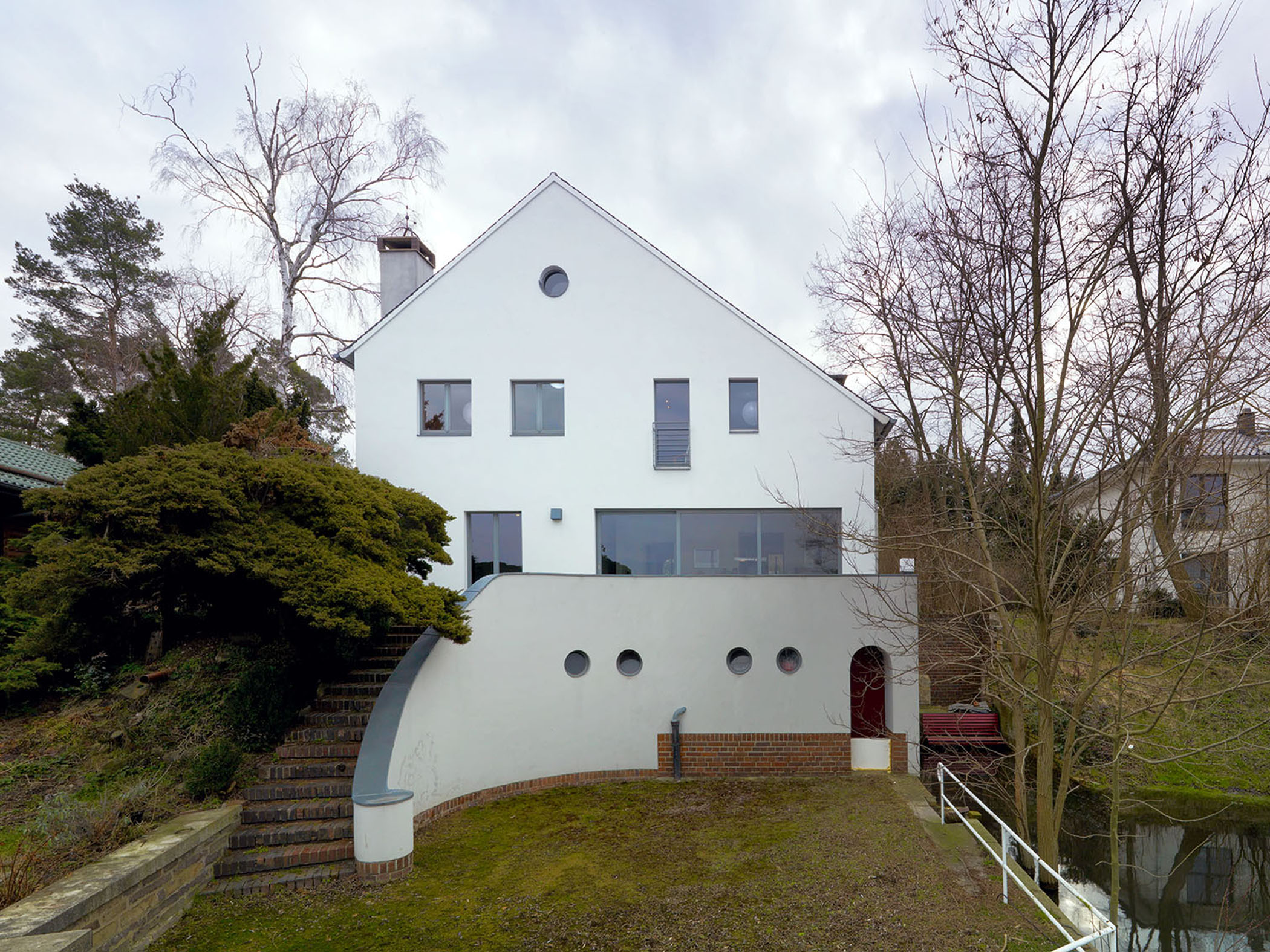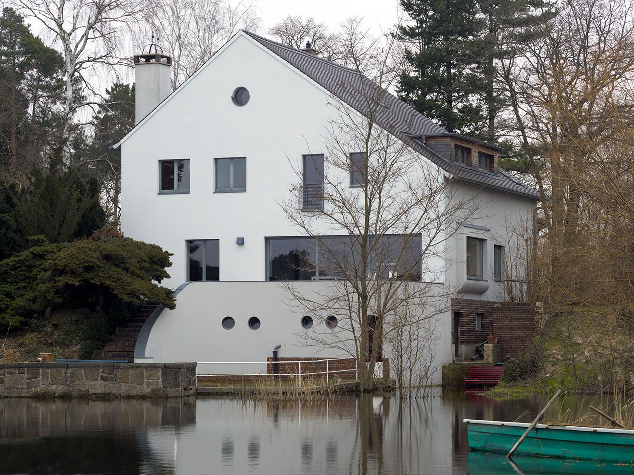Der Charme des 1936 errichteten Hauses konnte durch den behutsamen Umgang mit der Gebäudesubstanz erhalten werden. Durch die konsequente Ausrichtung der Wohnräume zum angrenzenden Großsteinberger See wird die einzigartige Lage des Privathauses unterstrichen. Großflächige Verglasung auf der Seeseite lassen eine unmittelbare Beziehung zwischen Innen und Außen entstehen.