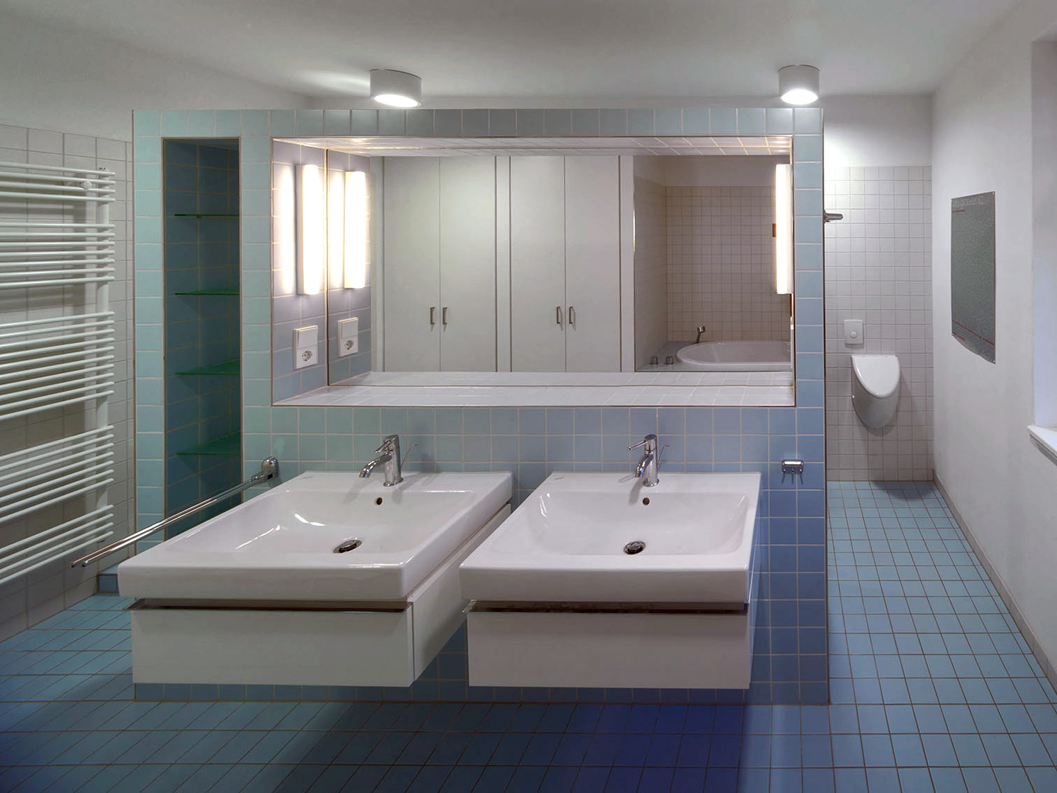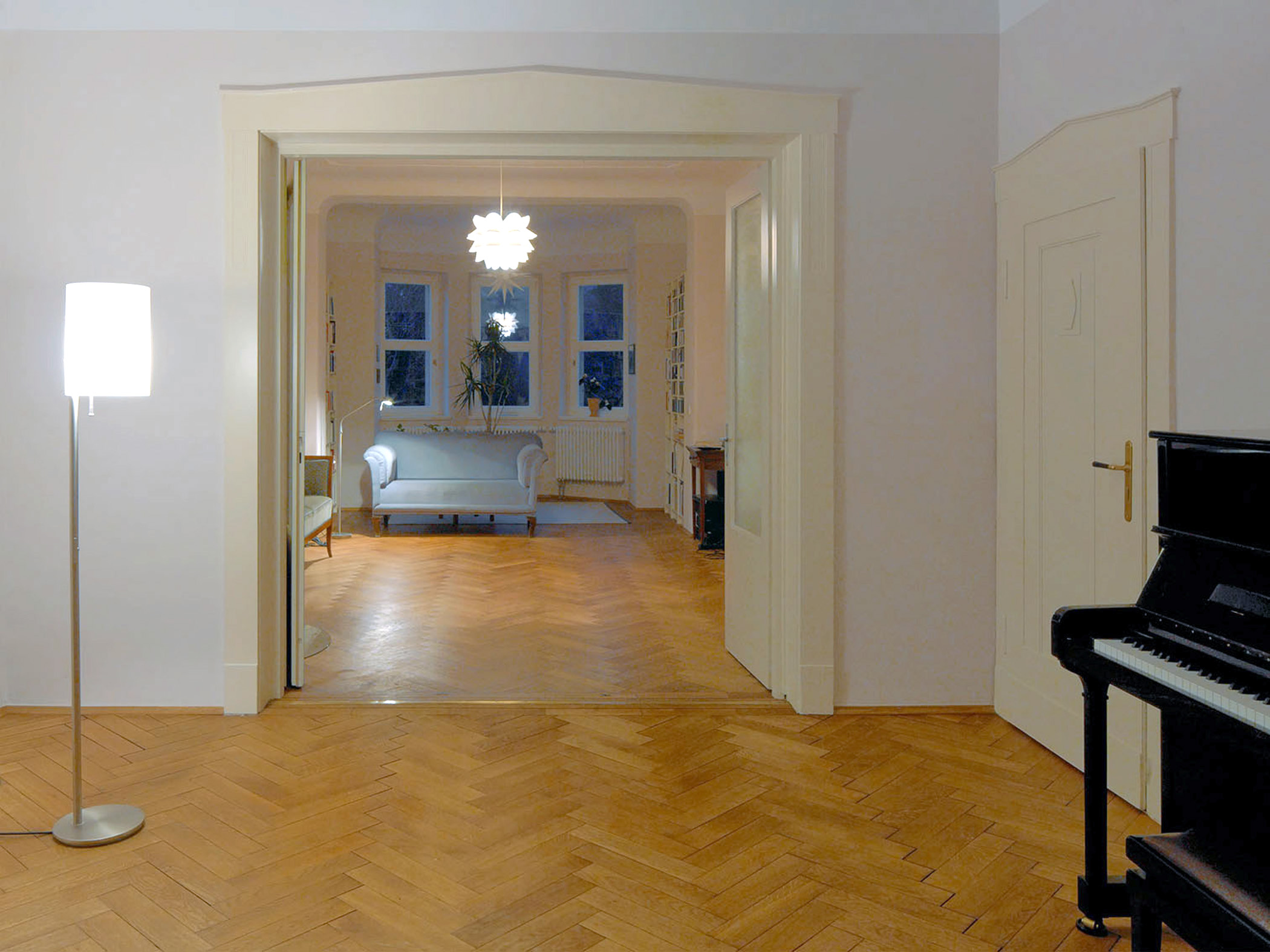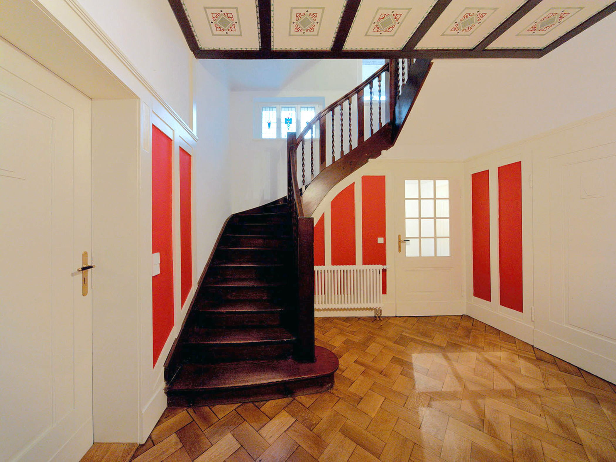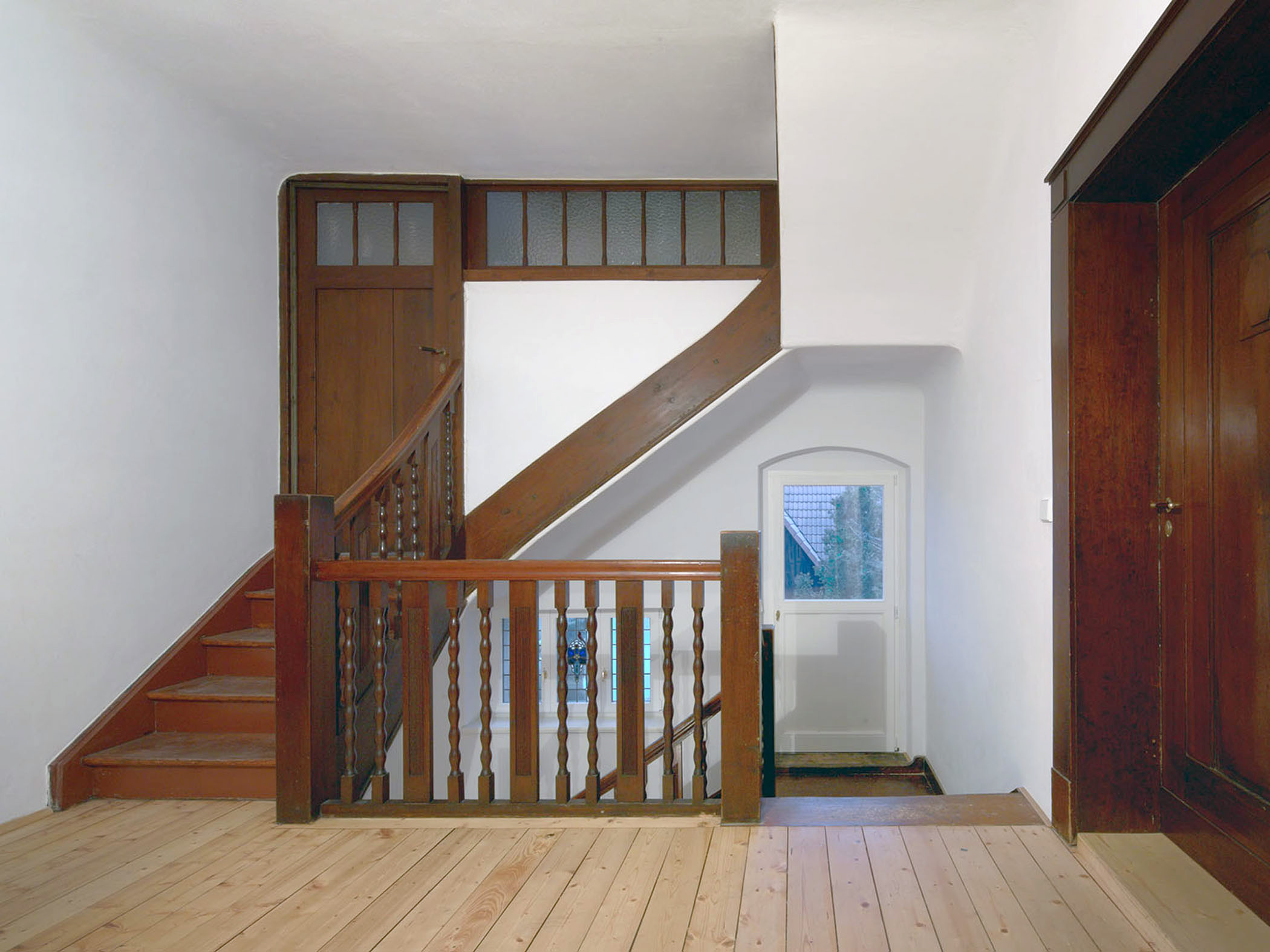 Der Umbau des denkmalgeschützten Reihenendhauses aus dem Jahr 1914 wurde mit minimalen Eingriffen in die historische Struktur des Gebäudes umgesetzt. Durch Abbruch von wenigen Wänden entstanden großzügige Räume. Die gut erhaltenen, wiederaufgearbeiteten Holzfußböden unterstützen mit Ihrer warmen Materialität das neue Farbkonzept. Während die Farbigkeit der Räume nur dezent in Erscheinung tritt, hebt sich das im Original erhaltene Treppenhaus durch einen kräftigen Farbakzent ab.