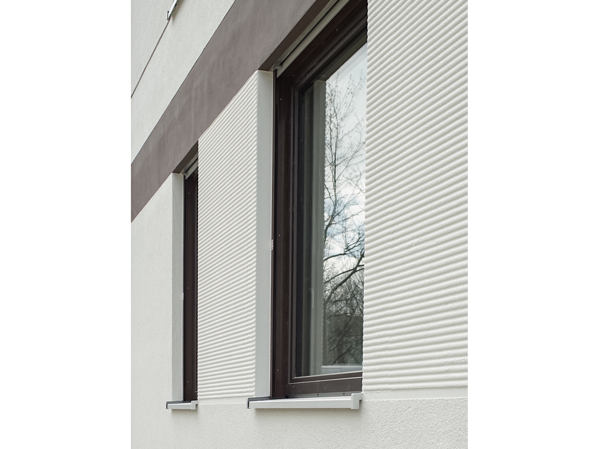 Die Balkonplatten der einzelnen Geschosse springen vor und zurück, so dass eine dynamische Bewegung vor den kubischen Baukörpern entsteht. Auch vertikal bewegen sich die Balkonbrüstungen vom Hochpunkt in der Balkonecke zum Tiefpunkt an den Balkonrändern, die sich von dort als Streifen um die gesamten Gebäude legen. Geplant war, die Materialität der Balkonbrüstung ( Trespa ) auch auf den Putzfassaden herumzuführen. Aus Kostengründen legte der Bauherr aber die Fortführung lediglich als Farbstreifen fest. Der besonders großzügige Freiraum der Balkone entlang der gesamten Wohnung generiert eine hohe Wohnqualität und einen engen Bezug zwischen Innen und Außen.