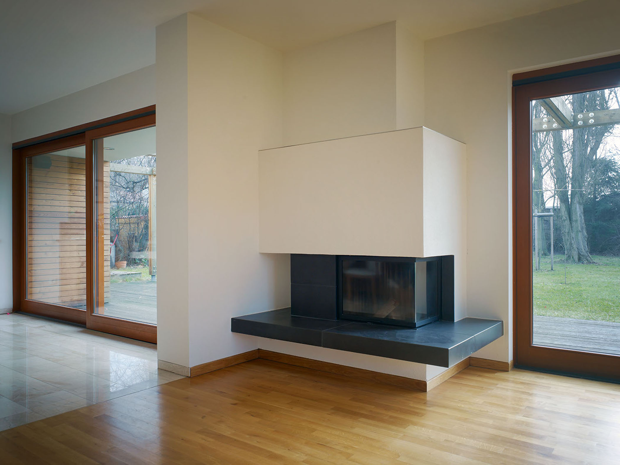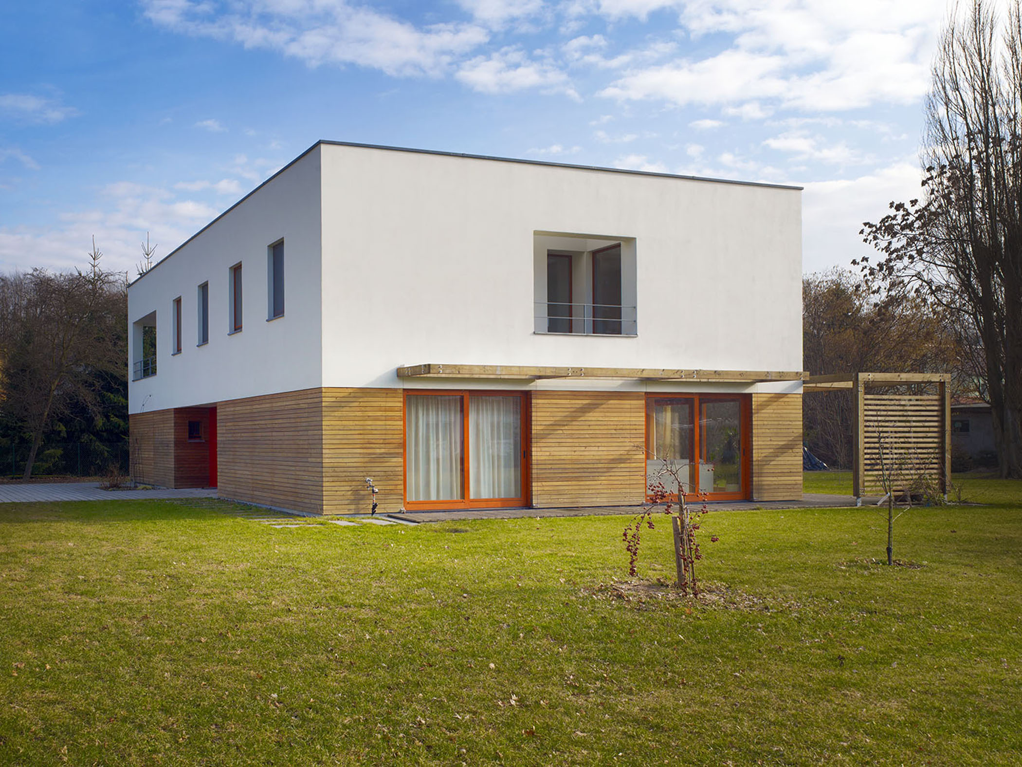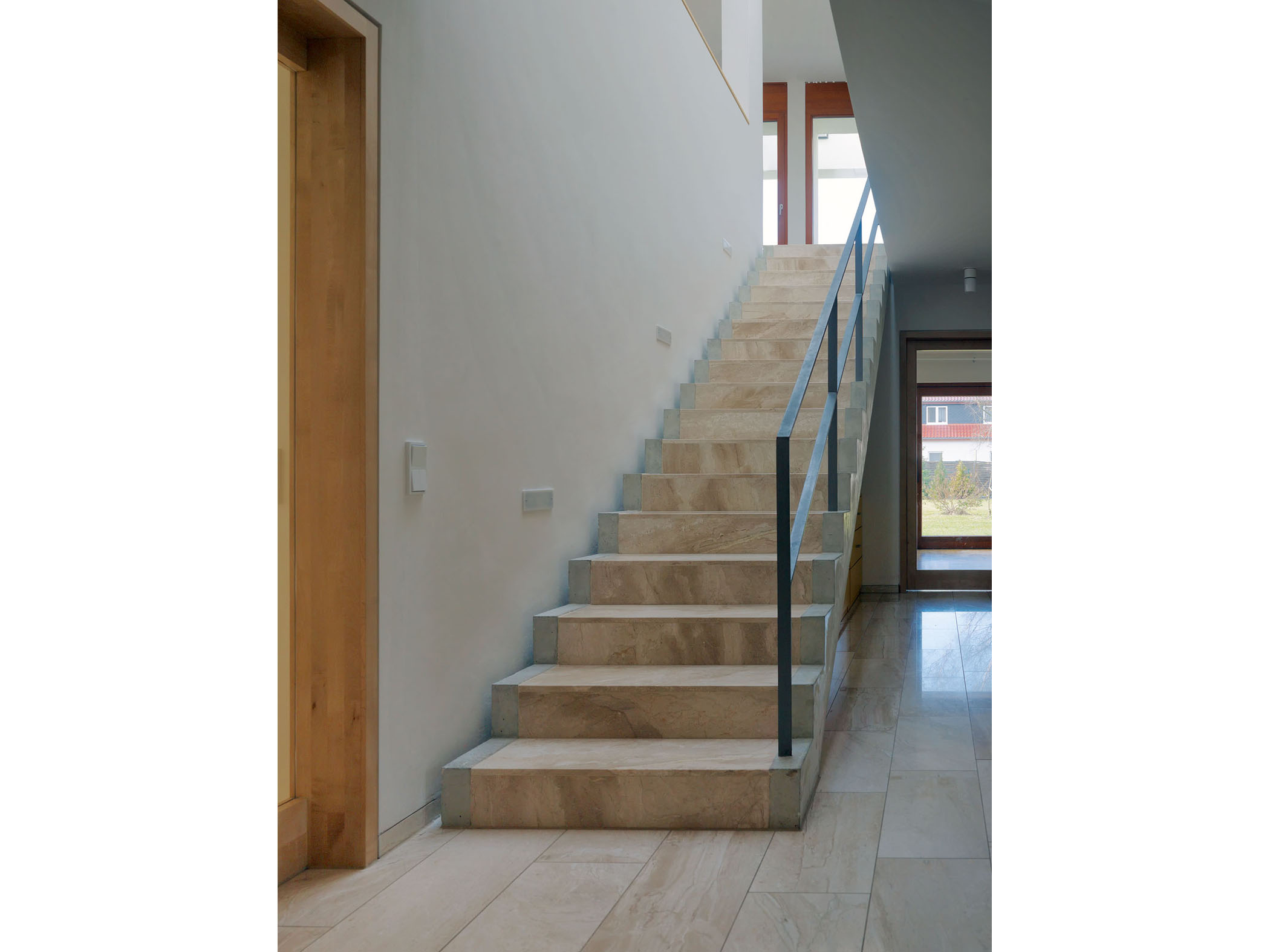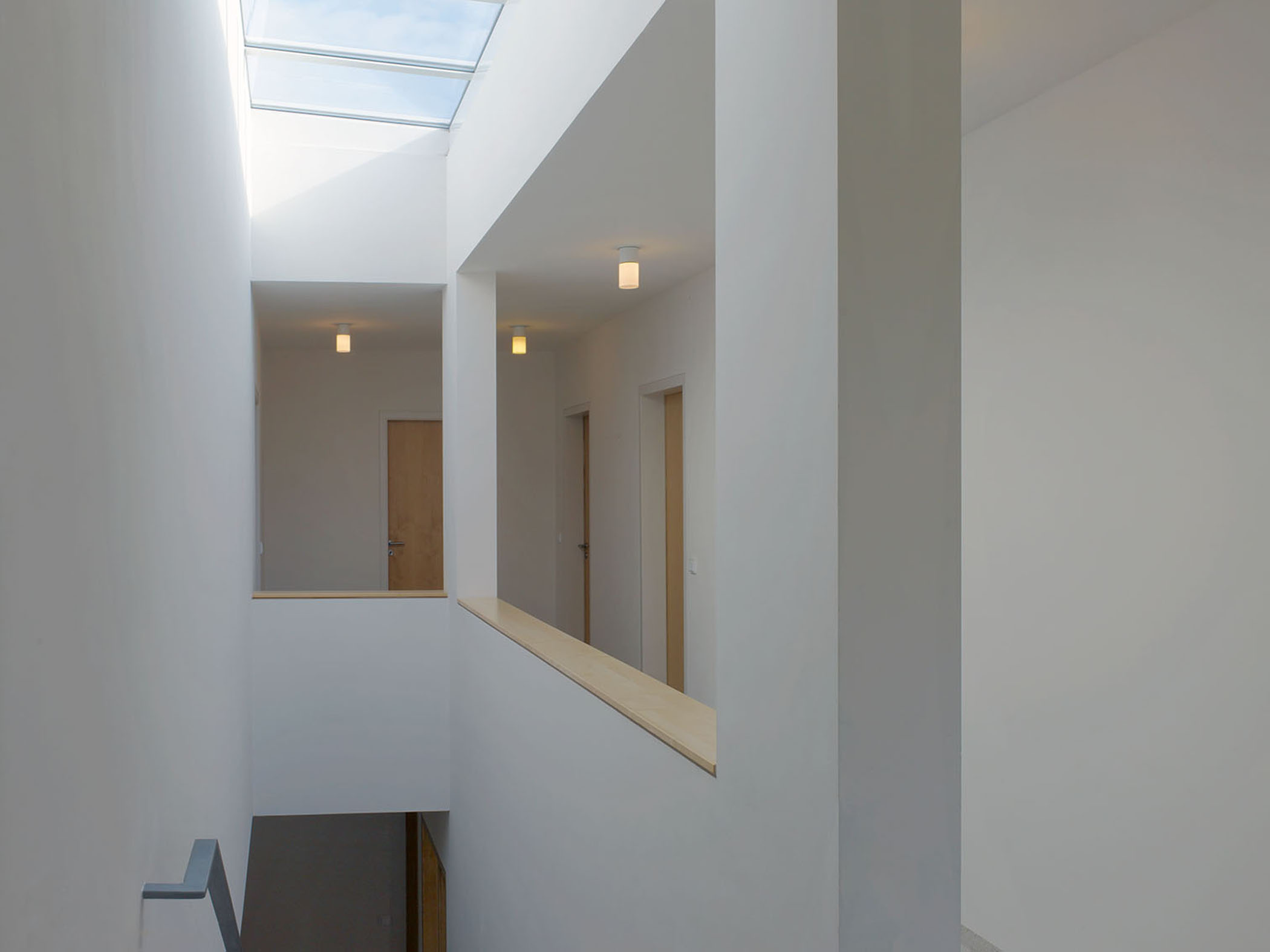 Der klare und einfache Baukörper des Wohnhauses erhält durch die zweigeteilte Fassade eine horizontale Ausrichtung. Großzügige Fassadenöffnungen verbinden die Wohnebene des Erdgeschosses mit dem Garten. Ein großes Oberlicht überspannt den Treppenraum und lässt das Tageslicht tief ins Hausinnere dringen.